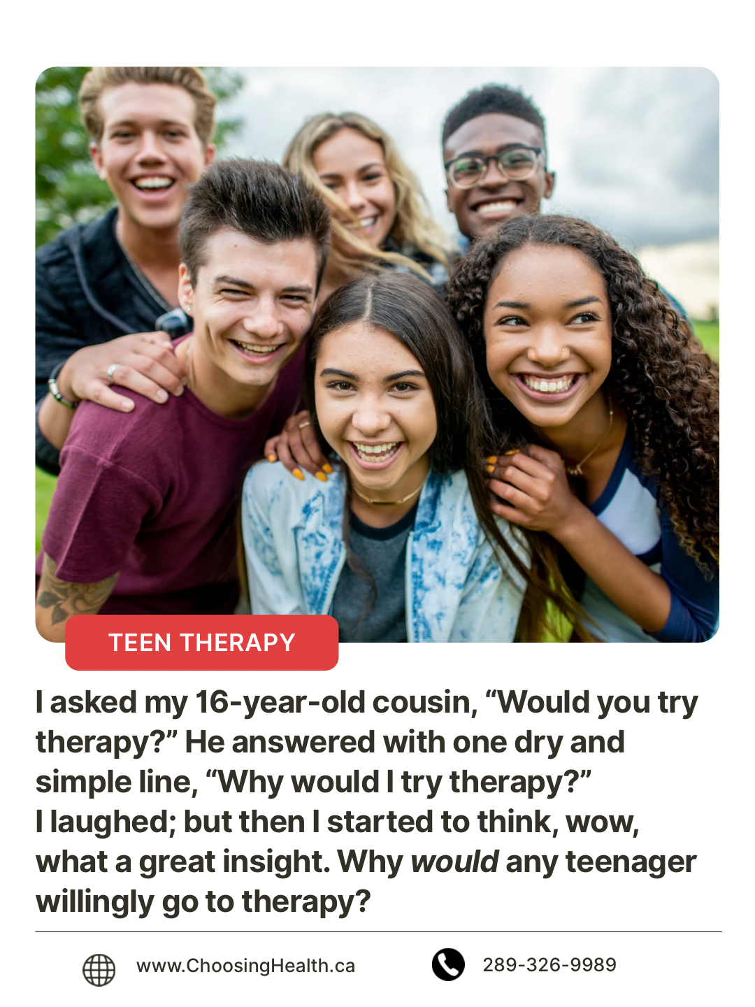 While preparing to write this blog, I asked my 16-year-old cousin, “Would you try therapy?” He answered with one dry and simple line, “Why would I try therapy?” I laughed; but then I started to think, wow, what a great insight. Why would any teenager willingly go to therapy?